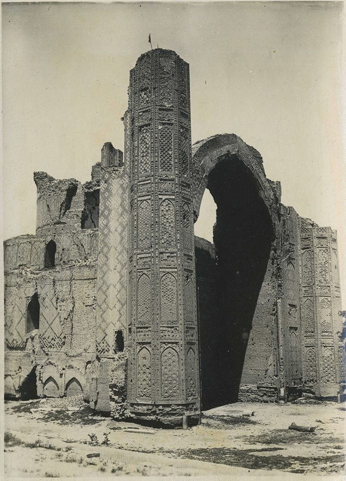 The Bibi Khanum Congregational Mosque (1398– 1405) was conceived as the most significant architectural expression of Timur’s rule. The mosque was the most ambitious building project initiated during his lifetime and can be visited today in a 20th-century restoration. It is very likely that the construction was never completed, which can explain the dilapidated state of the monument at the end of the 19th century. At the nadir of its decay, it had been reduced to a core of the main sanctuary, its dome having collapsed and the iwan (monumental gate) of its façade reduced to a perilously suspended fragment. The small northern and southern mosques facing on the large open courtyard were also in ruins and without their domes. Of the huge entrance iwan only the side pillars remained. Nothing was left of the domed galleries that connected all these elements; only the north-western minaret had survived.