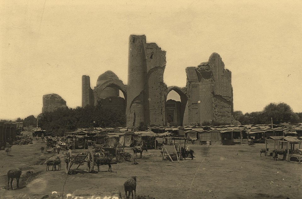 The Bibi Khanum Congregational Mosque (1398– 1405) was conceived as the most significant architectural expression of Timur’s rule. The mosque was the most ambitious building project initiated during his lifetime and can be visited today in a 20th-century restoration. It is very likely that the construction was never completed, which can explain the dilapidated state of the monument at the end of the 19th century. At the nadir of its decay, it had been reduced to a core of the main sanctuary, its dome having collapsed and the iwan (monumental gate) of its façade reduced to a perilously suspended fragment. The small northern and southern mosques facing on the large open courtyard were also in ruins and without their domes. Of the huge entrance iwan only the side pillars remained. Nothing was left of the domed galleries that connected all these elements; only the north-western minaret had survived.