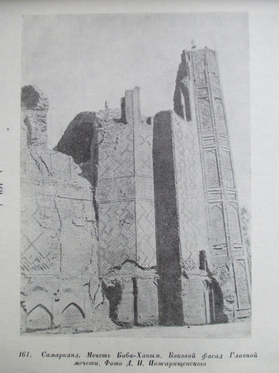 The Bibi Khanum Mosque was comprehensively studied by Shalva E. Ratiia in the 1940s. Ratiia drew up the first restoration plans based on its ruins and produced reconstruction watercolours. The renowned Soviet archaeologist and architect Galina A. Pugachenkova finalized the restoration plans for the mosque at the beginning of the 1950s. Further archaeological research was performed by Liia Iu. Man’kovskaia in 1967. After 1974 the restoration project was led by the architect Konstantin S. Kriukov, one of the most influential restorers in the Soviet period, who initiated the replacement of all brick loadbearing structures with reinforced concrete frames. Throughout the 1980s and 1990s the collapsed domes of the side mosques were rebuilt with reinforced concrete and new tiling was inserted along the domes’ ribbed outer shells. After 1985 the main sanctuary was adorned with massive pylons, decorated in mass-produced tiles. By the end of the 1990s the epigraphic programmes were executed anew.