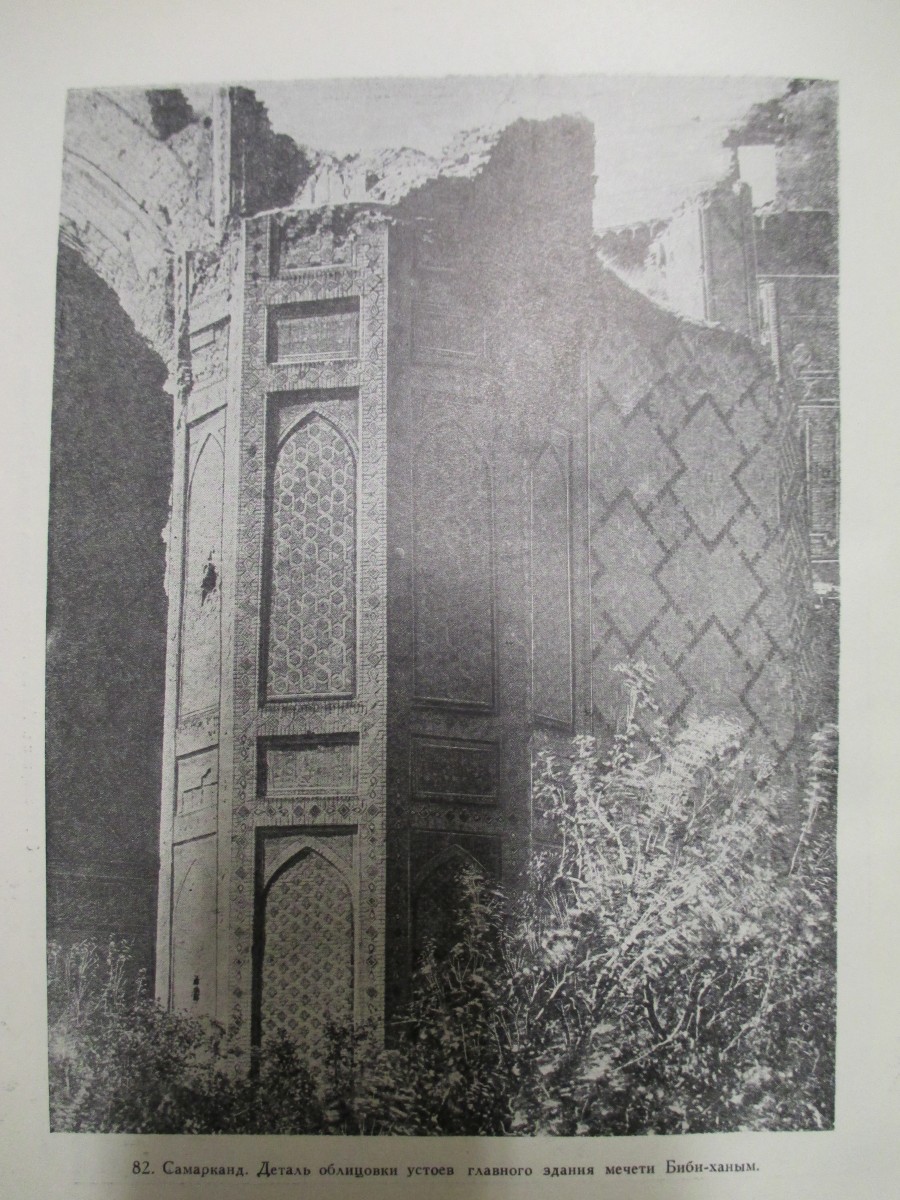 The Bibi Khanum Mosque was comprehensively studied by Shalva E. Ratiia in the 1940s. Ratiia drew up the first restoration plans based on its ruins and produced reconstruction watercolours. The renowned Soviet archaeologist and architect Galina A. Pugachenkova finalized the restoration plans for the mosque at the beginning of the 1950s. Further archaeological research was performed by Liia Iu. Man’kovskaia in 1967. After 1974 the restoration project was led by the architect Konstantin S. Kriukov, one of the most influential restorers in the Soviet period, who initiated the replacement of all brick loadbearing structures with reinforced concrete frames. Throughout the 1980s and 1990s the collapsed domes of the side mosques were rebuilt with reinforced concrete and new tiling was inserted along the domes’ ribbed outer shells. After 1985 the main sanctuary was adorned with massive pylons, decorated in mass-produced tiles. By the end of the 1990s the epigraphic programmes were executed anew.