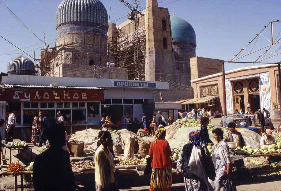 During the urban regeneration of Samarqand prior to the 2007 celebrations of the city’s 2750th anniversary, the whole square between the Bibi Khanum Mosque and the Bibi Khanum Mausoleum (early 15th century) was completely refurbished. In 2005–6, the octagonal mausoleum, which had been reduced to ruins, was adorned with a new pseudo-Timurid dome on a high drum and rebuilt facades with arched portals. The outer wall of the Bibi Khanum Madrasa was built up above ground level with modern brick to replicate the presumed position of the original guldasta (corner towers). Although no traces of the madrasa remain, Soviet scholars have stylistically compared it to the Ulugh Beg Madrasa on Registan Square.