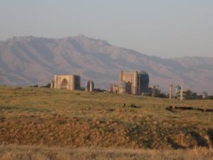 During the urban regeneration of Samarqand prior to the 2007 celebrations of the city’s 2750th  anniversary, the whole square between the Bibi Khanum Mosque and the Bibi Khanum Mausoleum (early 15th century) was completely refurbished. In 2005–6, the octagonal mausoleum, which had been reduced to ruins, was adorned with a new pseudo-Timurid dome on a high drum and rebuilt facades with arched portals. The outer wall of the Bibi Khanum Madrasa was built up above ground level with modern brick to replicate the presumed position of the original guldasta (corner towers). Although no traces of the madrasa remain, Soviet scholars have stylistically compared it to the Ulugh Beg Madrasa on Registan Square.