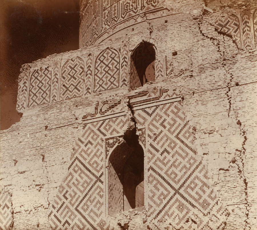 The Bibi Khanum Congregational Mosque (1398– 1405) was conceived as the most significant architectural expression of Timur’s rule. The mosque was the most ambitious building project initiated during his lifetime and can be visited today in a 20th-century restoration. It is very likely that the construction was never completed, which can explain the dilapidated state of the monument at the end of the 19th century. At the nadir of its decay, it had been reduced to a core of the main sanctuary, its dome having collapsed and the iwan (monumental gate) of its façade reduced to a perilously suspended fragment. The small northern and southern mosques facing on the large open courtyard were also in ruins and without their domes. Of the huge entrance iwan only the side pillars remained. Nothing was left of the domed galleries that connected all these elements; only the north-western minaret had survived.