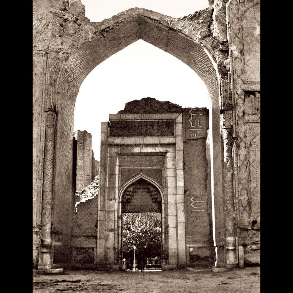 The Bibi Khanum Congregational Mosque (1398– 1405) was conceived as the most significant architectural expression of Timur’s rule. The mosque was the most ambitious building project initiated during his lifetime and can be visited today in a 20th-century restoration. It is very likely that the construction was never completed, which can explain the dilapidated state of the monument at the end of the 19th century. At the nadir of its decay, it had been reduced to a core of the main sanctuary, its dome having collapsed and the iwan (monumental gate) of its façade reduced to a perilously suspended fragment. The small northern and southern mosques facing on the large open courtyard were also in ruins and without their domes. Of the huge entrance iwan only the side pillars remained. Nothing was left of the domed galleries that connected all these elements; only the north-western minaret had survived.
