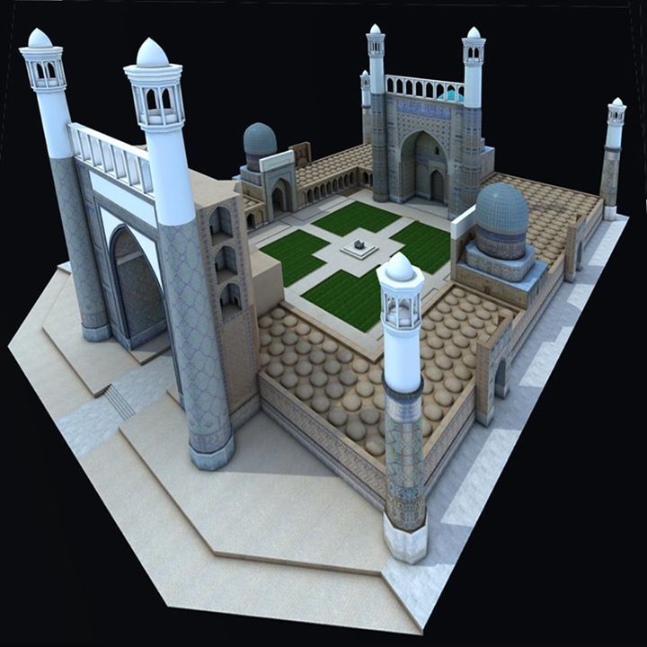 The Bibi Khanum Congregational Mosque (1398– 1405) was conceived as the most significant architectural expression of Timur’s rule. The mosque was the most ambitious building project initiated during his lifetime and can be visited today in a 20th-century restoration. It is very likely that the construction was never completed, which can explain the dilapidated state of the monument at the end of the 19th century. At the nadir of its decay, it had been reduced to a core of the main sanctuary, its dome having collapsed and the iwan (monumental gate) of its façade reduced to a perilously suspended fragment. The small northern and southern mosques facing on the large open courtyard were also in ruins and without their domes. Of the huge entrance iwan only the side pillars remained. Nothing was left of the domed galleries that connected all these elements; only the north-western minaret had survived.