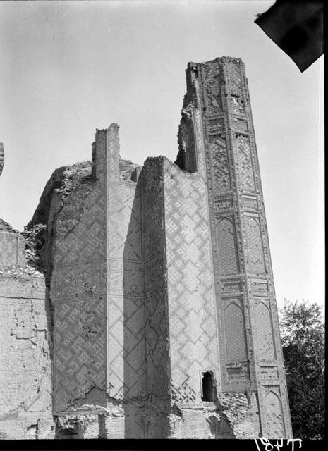The Bibi Khanum Mosque was comprehensively studied by Shalva E. Ratiia in the 1940s. Ratiia drew up the first restoration plans based on its ruins and produced reconstruction watercolours. The renowned Soviet archaeologist and architect Galina A. Pugachenkova finalized the restoration plans for the mosque at the beginning of the 1950s. Further archaeological research was performed by Liia Iu. Man’kovskaia in 1967. After 1974 the restoration project was led by the architect Konstantin S. Kriukov, one of the most influential restorers in the Soviet period, who initiated the replacement of all brick loadbearing structures with reinforced concrete frames. Throughout the 1980s and 1990s the collapsed domes of the side mosques were rebuilt with reinforced concrete and new tiling was inserted along the domes’ ribbed outer shells. After 1985 the main sanctuary was adorned with massive pylons, decorated in mass-produced tiles. By the end of the 1990s the epigraphic programmes were executed anew.