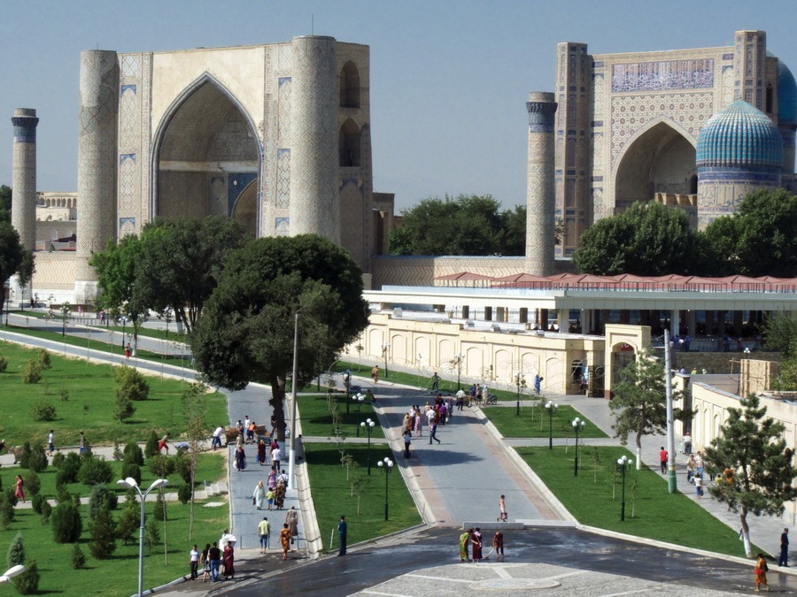 During the urban regeneration of Samarqand prior to the 2007 celebrations of the city’s 2750th  anniversary, the whole square between the Bibi Khanum Mosque and the Bibi Khanum Mausoleum (early 15th century) was completely refurbished. In 2005–6, the octagonal mausoleum, which had been reduced to ruins, was adorned with a new pseudo-Timurid dome on a high drum and rebuilt facades with arched portals. The outer wall of the Bibi Khanum Madrasa was built up above ground level with modern brick to replicate the presumed position of the original guldasta (corner towers). Although no traces of the madrasa remain, Soviet scholars have stylistically compared it to the Ulugh Beg Madrasa on Registan Square.