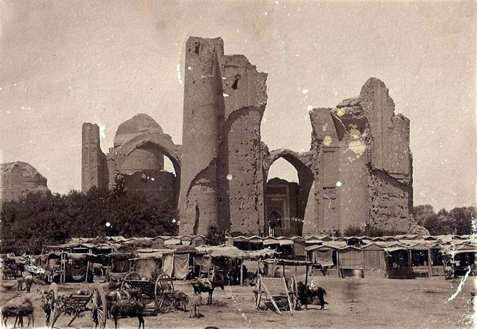 The Bibi Khanum Congregational Mosque (1398– 1405) was conceived as the most significant architectural expression of Timur’s rule. The mosque was the most ambitious building project initiated during his lifetime and can be visited today in a 20th-century restoration. It is very likely that the construction was never completed, which can explain the dilapidated state of the monument at the end of the 19th century. At the nadir of its decay, it had been reduced to a core of the main sanctuary, its dome having collapsed and the iwan (monumental gate) of its façade reduced to a perilously suspended fragment. The small northern and southern mosques facing on the large open courtyard were also in ruins and without their domes. Of the huge entrance iwan only the side pillars remained. Nothing was left of the domed galleries that connected all these elements; only the north-western minaret had survived.