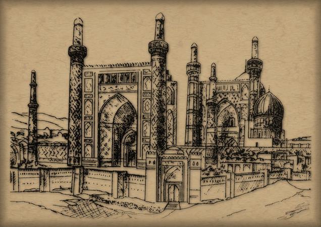 The Bibi Khanum Congregational Mosque (1398– 1405) was conceived as the most significant architectural expression of Timur’s rule. The mosque was the most ambitious building project initiated during his lifetime and can be visited today in a 20th-century restoration. It is very likely that the construction was never completed, which can explain the dilapidated state of the monument at the end of the 19th century. At the nadir of its decay, it had been reduced to a core of the main sanctuary, its dome having collapsed and the iwan (monumental gate) of its façade reduced to a perilously suspended fragment. The small northern and southern mosques facing on the large open courtyard were also in ruins and without their domes. Of the huge entrance iwan only the side pillars remained. Nothing was left of the domed galleries that connected all these elements; only the north-western minaret had survived.