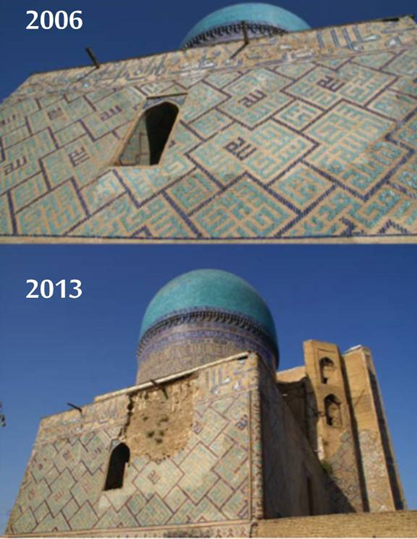 During the urban regeneration of Samarqand prior to the 2007 celebrations of the city’s 2750th  anniversary, the whole square between the Bibi Khanum Mosque and the Bibi Khanum Mausoleum (early 15th century) was completely refurbished. In 2005–6, the octagonal mausoleum, which had been reduced to ruins, was adorned with a new pseudo-Timurid dome on a high drum and rebuilt facades with arched portals. The outer wall of the Bibi Khanum Madrasa was built up above ground level with modern brick to replicate the presumed position of the original guldasta (corner towers). Although no traces of the madrasa remain, Soviet scholars have stylistically compared it to the Ulugh Beg Madrasa on Registan Square.