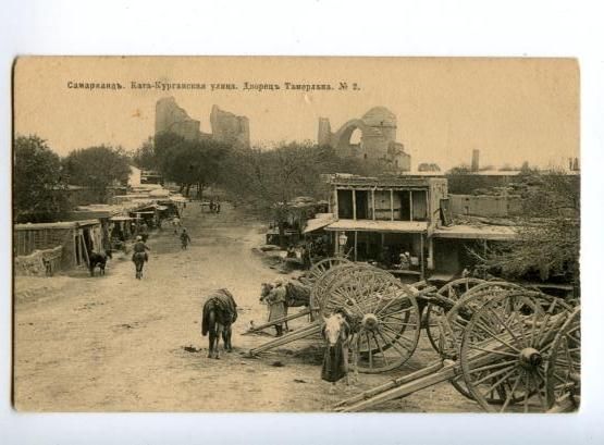 During the urban regeneration of Samarqand prior to the 2007 celebrations of the city’s 2750th  anniversary, the whole square between the Bibi Khanum Mosque and the Bibi Khanum Mausoleum (early 15th century) was completely refurbished. In 2005–6, the octagonal mausoleum, which had been reduced to ruins, was adorned with a new pseudo-Timurid dome on a high drum and rebuilt facades with arched portals. The outer wall of the Bibi Khanum Madrasa was built up above ground level with modern brick to replicate the presumed position of the original guldasta (corner towers). Although no traces of the madrasa remain, Soviet scholars have stylistically compared it to the Ulugh Beg Madrasa on Registan Square.