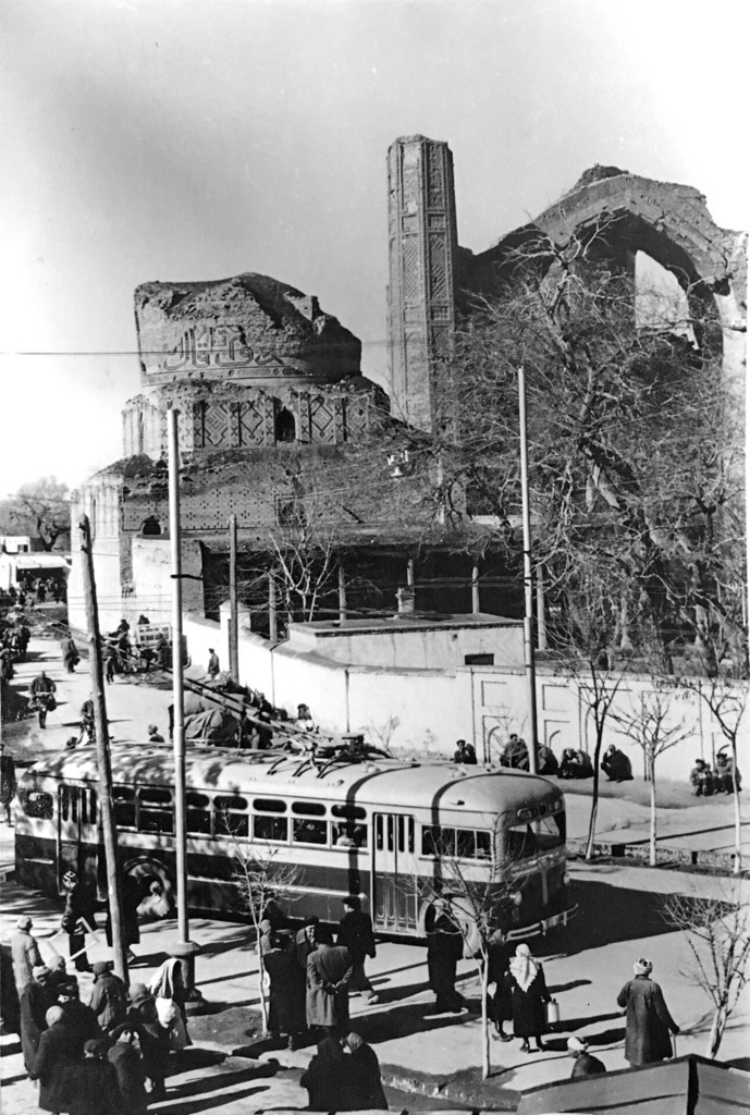 The Bibi Khanum Mosque was comprehensively studied by Shalva E. Ratiia in the 1940s. Ratiia drew up the first restoration plans based on its ruins and produced reconstruction watercolours. The renowned Soviet archaeologist and architect Galina A. Pugachenkova finalized the restoration plans for the mosque at the beginning of the 1950s. Further archaeological research was performed by Liia Iu. Man’kovskaia in 1967. After 1974 the restoration project was led by the architect Konstantin S. Kriukov, one of the most influential restorers in the Soviet period, who initiated the replacement of all brick loadbearing structures with reinforced concrete frames. Throughout the 1980s and 1990s the collapsed domes of the side mosques were rebuilt with reinforced concrete and new tiling was inserted along the domes’ ribbed outer shells. After 1985 the main sanctuary was adorned with massive pylons, decorated in mass-produced tiles. By the end of the 1990s the epigraphic programmes were executed anew.