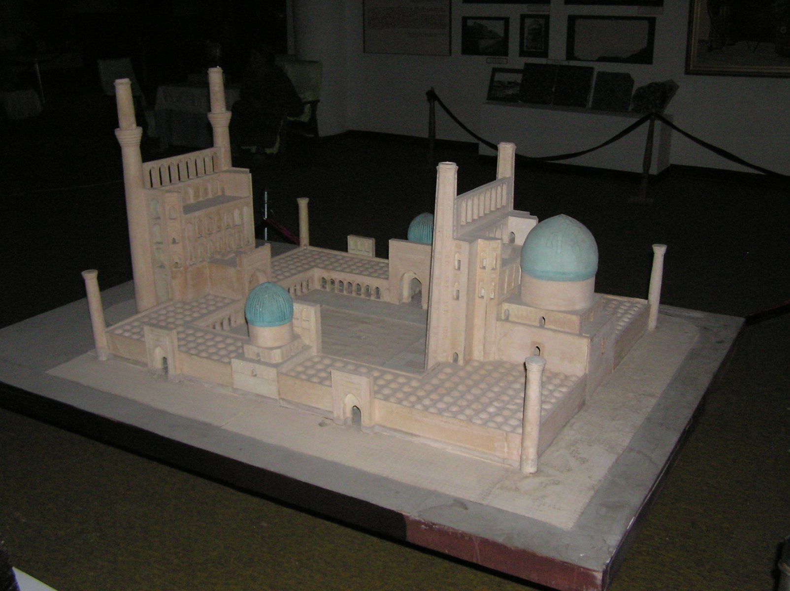 The Bibi Khanum Congregational Mosque (1398– 1405) was conceived as the most significant architectural expression of Timur’s rule. The mosque was the most ambitious building project initiated during his lifetime and can be visited today in a 20th-century restoration. It is very likely that the construction was never completed, which can explain the dilapidated state of the monument at the end of the 19th century. At the nadir of its decay, it had been reduced to a core of the main sanctuary, its dome having collapsed and the iwan (monumental gate) of its façade reduced to a perilously suspended fragment. The small northern and southern mosques facing on the large open courtyard were also in ruins and without their domes. Of the huge entrance iwan only the side pillars remained. Nothing was left of the domed galleries that connected all these elements; only the north-western minaret had survived.