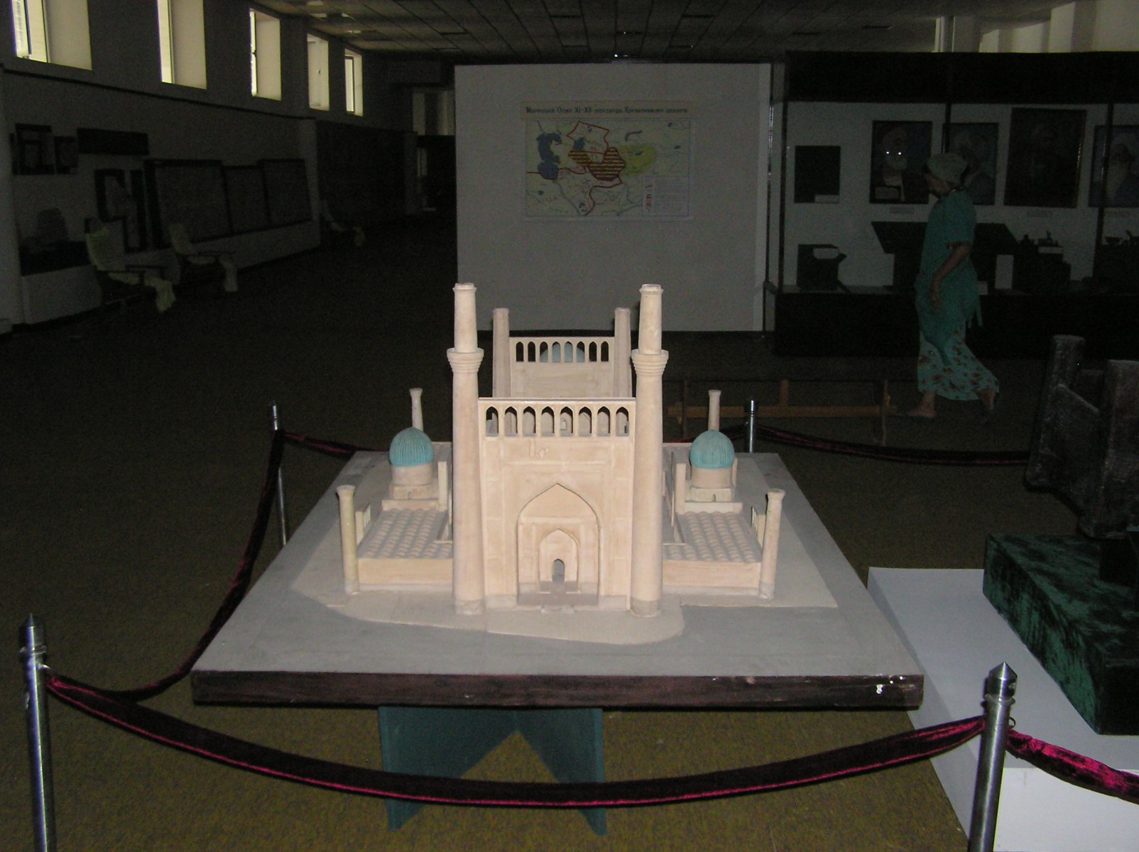 During the urban regeneration of Samarqand prior to the 2007 celebrations of the city’s 2750th  anniversary, the whole square between the Bibi Khanum Mosque and the Bibi Khanum Mausoleum (early 15th century) was completely refurbished. In 2005–6, the octagonal mausoleum, which had been reduced to ruins, was adorned with a new pseudo-Timurid dome on a high drum and rebuilt facades with arched portals. The outer wall of the Bibi Khanum Madrasa was built up above ground level with modern brick to replicate the presumed position of the original guldasta (corner towers). Although no traces of the madrasa remain, Soviet scholars have stylistically compared it to the Ulugh Beg Madrasa on Registan Square.