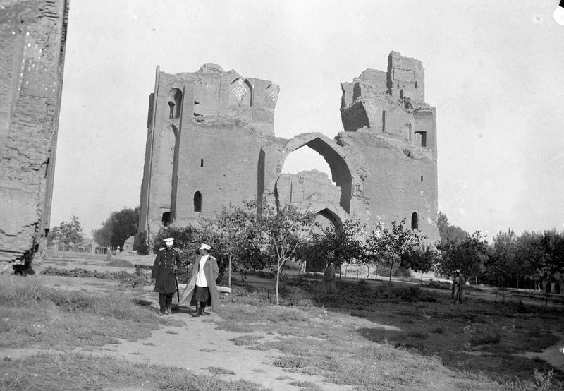 The Bibi Khanum Congregational Mosque (1398– 1405) was conceived as the most significant architectural expression of Timur’s rule. The mosque was the most ambitious building project initiated during his lifetime and can be visited today in a 20th-century restoration. It is very likely that the construction was never completed, which can explain the dilapidated state of the monument at the end of the 19th century. At the nadir of its decay, it had been reduced to a core of the main sanctuary, its dome having collapsed and the iwan (monumental gate) of its façade reduced to a perilously suspended fragment. The small northern and southern mosques facing on the large open courtyard were also in ruins and without their domes. Of the huge entrance iwan only the side pillars remained. Nothing was left of the domed galleries that connected all these elements; only the north-western minaret had survived.