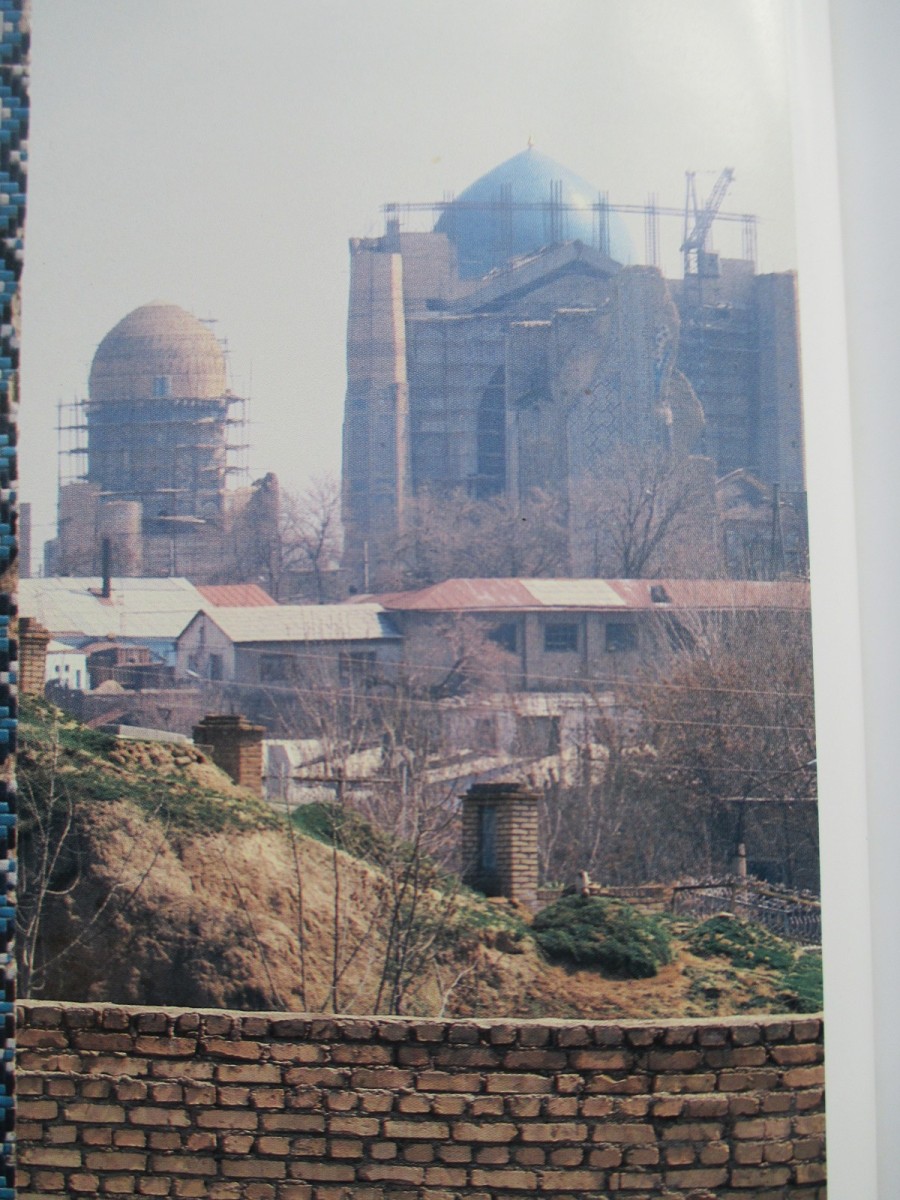 The Bibi Khanum Mosque was comprehensively studied by Shalva E. Ratiia in the 1940s. Ratiia drew up the first restoration plans based on its ruins and produced reconstruction watercolours. The renowned Soviet archaeologist and architect Galina A. Pugachenkova finalized the restoration plans for the mosque at the beginning of the 1950s. Further archaeological research was performed by Liia Iu. Man’kovskaia in 1967. After 1974 the restoration project was led by the architect Konstantin S. Kriukov, one of the most influential restorers in the Soviet period, who initiated the replacement of all brick loadbearing structures with reinforced concrete frames. Throughout the 1980s and 1990s the collapsed domes of the side mosques were rebuilt with reinforced concrete and new tiling was inserted along the domes’ ribbed outer shells. After 1985 the main sanctuary was adorned with massive pylons, decorated in mass-produced tiles. By the end of the 1990s the epigraphic programmes were executed anew.