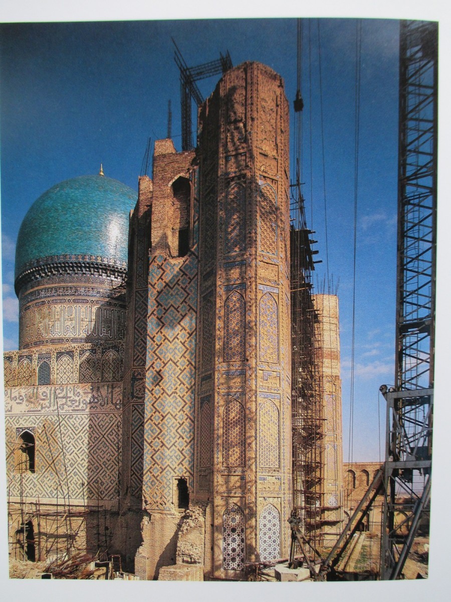The Bibi Khanum Congregational Mosque (1398– 1405) was conceived as the most significant architectural expression of Timur’s rule. The mosque was the most ambitious building project initiated during his lifetime and can be visited today in a 20th-century restoration. It is very likely that the construction was never completed, which can explain the dilapidated state of the monument at the end of the 19th century. At the nadir of its decay, it had been reduced to a core of the main sanctuary, its dome having collapsed and the iwan (monumental gate) of its façade reduced to a perilously suspended fragment. The small northern and southern mosques facing on the large open courtyard were also in ruins and without their domes. Of the huge entrance iwan only the side pillars remained. Nothing was left of the domed galleries that connected all these elements; only the north-western minaret had survived.