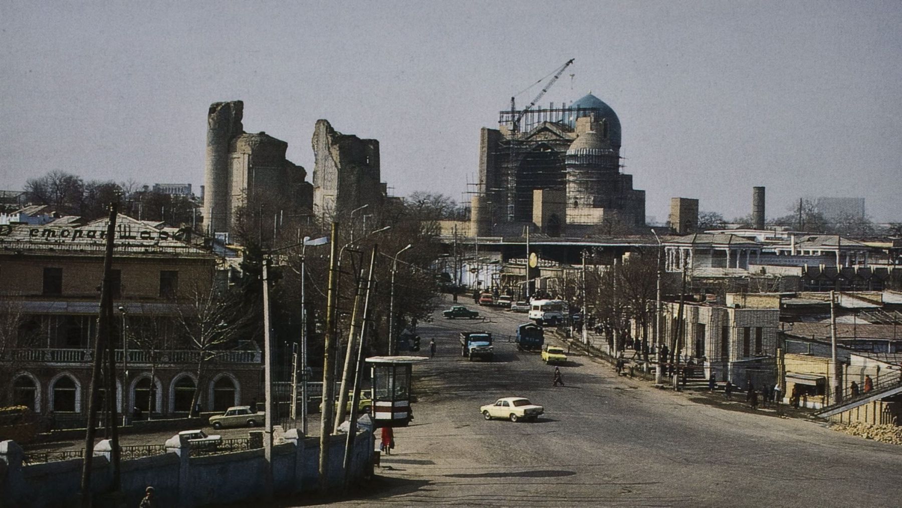 During the urban regeneration of Samarqand prior to the 2007 celebrations of the city’s 2750th  anniversary, the whole square between the Bibi Khanum Mosque and the Bibi Khanum Mausoleum (early 15th century) was completely refurbished. In 2005–6, the octagonal mausoleum, which had been reduced to ruins, was adorned with a new pseudo-Timurid dome on a high drum and rebuilt facades with arched portals. The outer wall of the Bibi Khanum Madrasa was built up above ground level with modern brick to replicate the presumed position of the original guldasta (corner towers). Although no traces of the madrasa remain, Soviet scholars have stylistically compared it to the Ulugh Beg Madrasa on Registan Square.