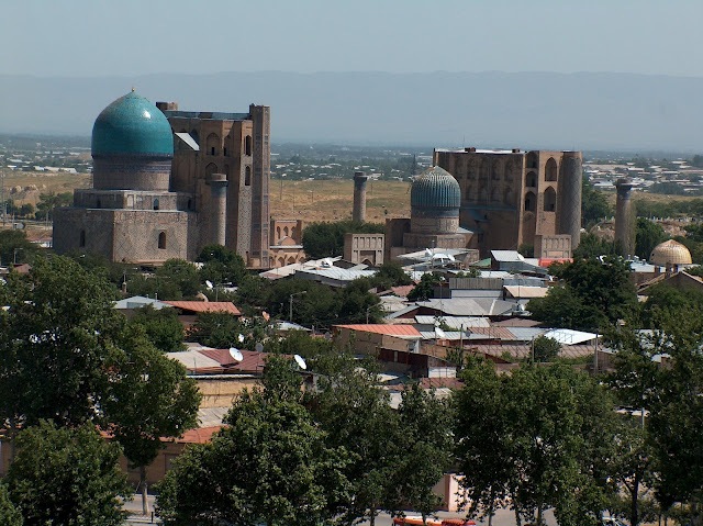 During the urban regeneration of Samarqand prior to the 2007 celebrations of the city’s 2750th  anniversary, the whole square between the Bibi Khanum Mosque and the Bibi Khanum Mausoleum (early 15th century) was completely refurbished. In 2005–6, the octagonal mausoleum, which had been reduced to ruins, was adorned with a new pseudo-Timurid dome on a high drum and rebuilt facades with arched portals. The outer wall of the Bibi Khanum Madrasa was built up above ground level with modern brick to replicate the presumed position of the original guldasta (corner towers). Although no traces of the madrasa remain, Soviet scholars have stylistically compared it to the Ulugh Beg Madrasa on Registan Square.