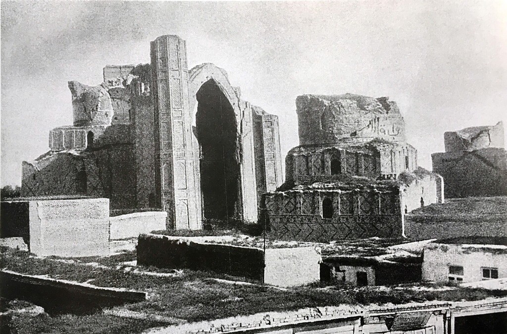 The Bibi Khanum Congregational Mosque (1398– 1405) was conceived as the most significant architectural expression of Timur’s rule. The mosque was the most ambitious building project initiated during his lifetime and can be visited today in a 20th-century restoration. It is very likely that the construction was never completed, which can explain the dilapidated state of the monument at the end of the 19th century. At the nadir of its decay, it had been reduced to a core of the main sanctuary, its dome having collapsed and the iwan (monumental gate) of its façade reduced to a perilously suspended fragment. The small northern and southern mosques facing on the large open courtyard were also in ruins and without their domes. Of the huge entrance iwan only the side pillars remained. Nothing was left of the domed galleries that connected all these elements; only the north-western minaret had survived.