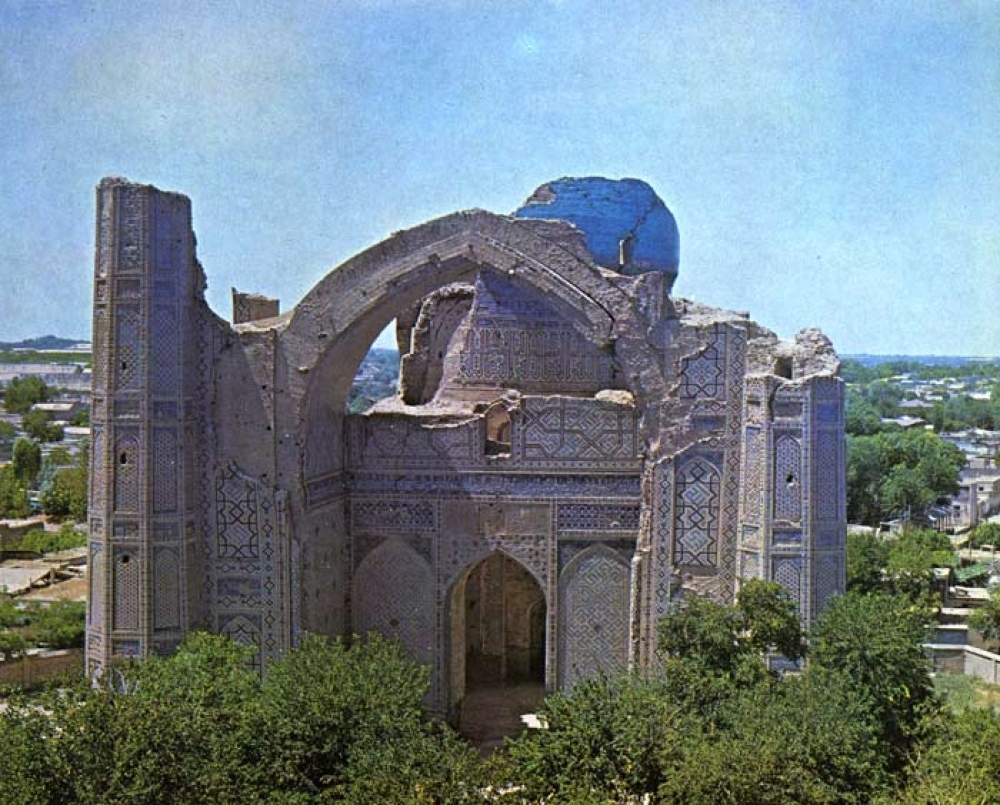 The Bibi Khanum Congregational Mosque (1398– 1405) was conceived as the most significant architectural expression of Timur’s rule. The mosque was the most ambitious building project initiated during his lifetime and can be visited today in a 20th-century restoration. It is very likely that the construction was never completed, which can explain the dilapidated state of the monument at the end of the 19th century. At the nadir of its decay, it had been reduced to a core of the main sanctuary, its dome having collapsed and the iwan (monumental gate) of its façade reduced to a perilously suspended fragment. The small northern and southern mosques facing on the large open courtyard were also in ruins and without their domes. Of the huge entrance iwan only the side pillars remained. Nothing was left of the domed galleries that connected all these elements; only the north-western minaret had survived.