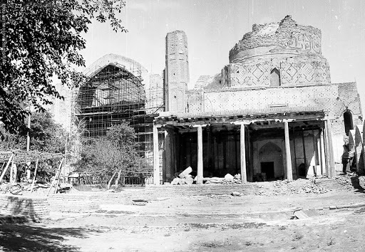 The Bibi Khanum Mosque was comprehensively studied by Shalva E. Ratiia in the 1940s. Ratiia drew up the first restoration plans based on its ruins and produced reconstruction watercolours. The renowned Soviet archaeologist and architect Galina A. Pugachenkova finalized the restoration plans for the mosque at the beginning of the 1950s. Further archaeological research was performed by Liia Iu. Man’kovskaia in 1967. After 1974 the restoration project was led by the architect Konstantin S. Kriukov, one of the most influential restorers in the Soviet period, who initiated the replacement of all brick loadbearing structures with reinforced concrete frames. Throughout the 1980s and 1990s the collapsed domes of the side mosques were rebuilt with reinforced concrete and new tiling was inserted along the domes’ ribbed outer shells. After 1985 the main sanctuary was adorned with massive pylons, decorated in mass-produced tiles. By the end of the 1990s the epigraphic programmes were executed anew.
