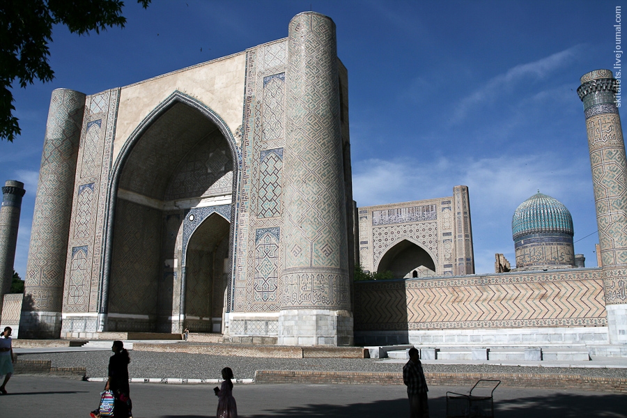 During the urban regeneration of Samarqand prior to the 2007 celebrations of the city’s 2750th  anniversary, the whole square between the Bibi Khanum Mosque and the Bibi Khanum Mausoleum (early 15th century) was completely refurbished. In 2005–6, the octagonal mausoleum, which had been reduced to ruins, was adorned with a new pseudo-Timurid dome on a high drum and rebuilt facades with arched portals. The outer wall of the Bibi Khanum Madrasa was built up above ground level with modern brick to replicate the presumed position of the original guldasta (corner towers). Although no traces of the madrasa remain, Soviet scholars have stylistically compared it to the Ulugh Beg Madrasa on Registan Square.