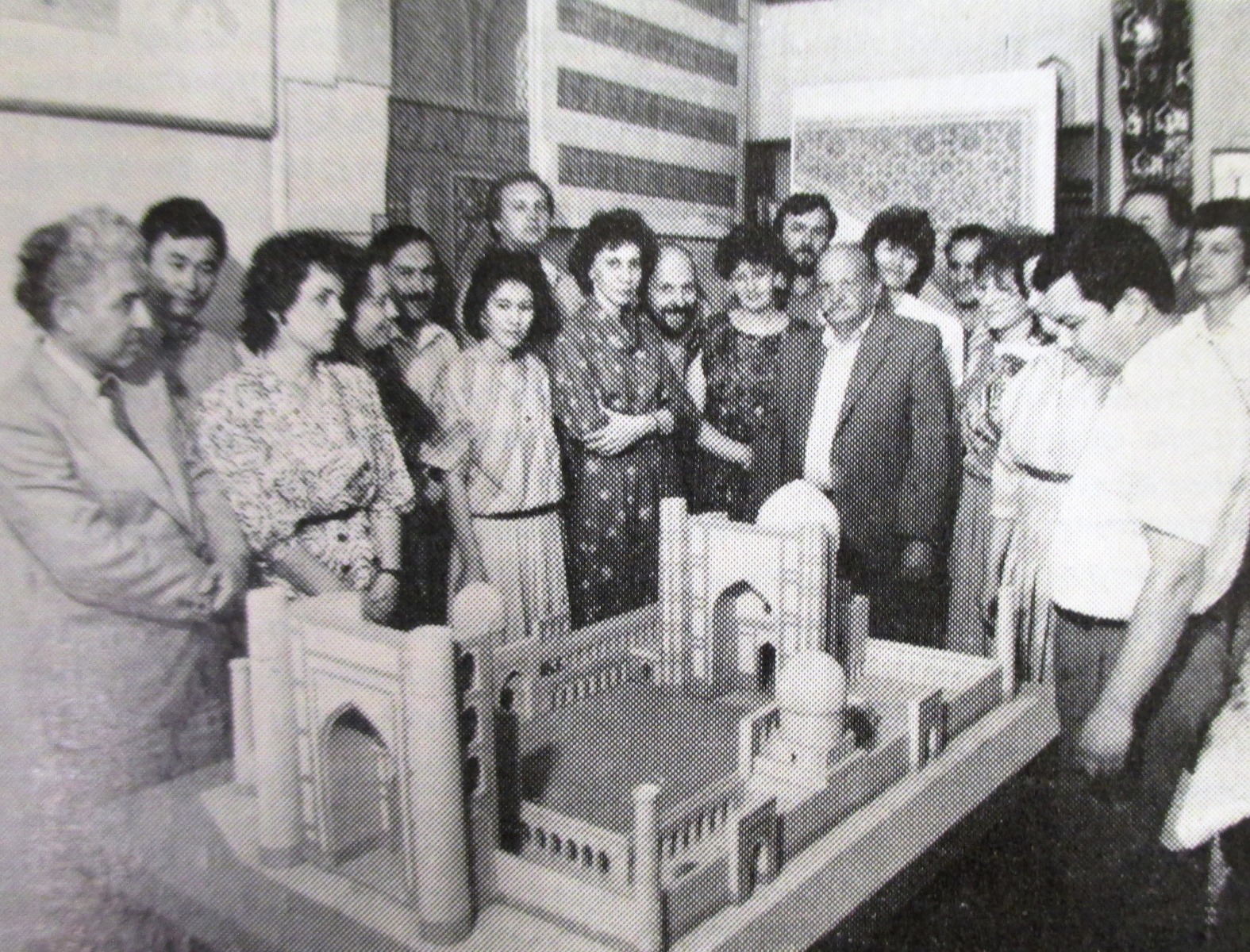 The Bibi Khanum Mosque was comprehensively studied by Shalva E. Ratiia in the 1940s. Ratiia drew up the first restoration plans based on its ruins and produced reconstruction watercolours. The renowned Soviet archaeologist and architect Galina A. Pugachenkova finalized the restoration plans for the mosque at the beginning of the 1950s. Further archaeological research was performed by Liia Iu. Man’kovskaia in 1967. After 1974 the restoration project was led by the architect Konstantin S. Kriukov, one of the most influential restorers in the Soviet period, who initiated the replacement of all brick loadbearing structures with reinforced concrete frames. Throughout the 1980s and 1990s the collapsed domes of the side mosques were rebuilt with reinforced concrete and new tiling was inserted along the domes’ ribbed outer shells. After 1985 the main sanctuary was adorned with massive pylons, decorated in mass-produced tiles. By the end of the 1990s the epigraphic programmes were executed anew.