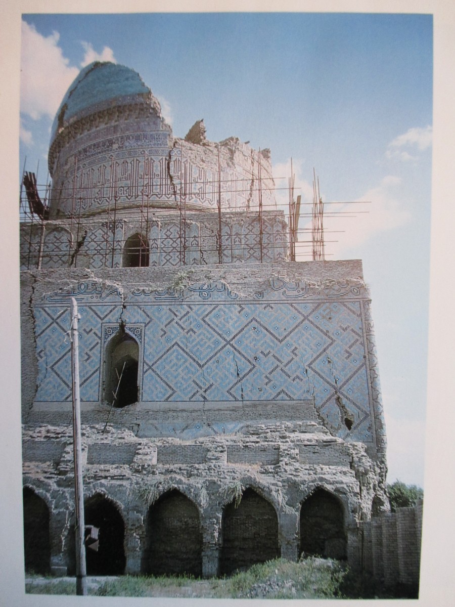 The Bibi Khanum Mosque was comprehensively studied by Shalva E. Ratiia in the 1940s. Ratiia drew up the first restoration plans based on its ruins and produced reconstruction watercolours. The renowned Soviet archaeologist and architect Galina A. Pugachenkova finalized the restoration plans for the mosque at the beginning of the 1950s. Further archaeological research was performed by Liia Iu. Man’kovskaia in 1967. After 1974 the restoration project was led by the architect Konstantin S. Kriukov, one of the most influential restorers in the Soviet period, who initiated the replacement of all brick loadbearing structures with reinforced concrete frames. Throughout the 1980s and 1990s the collapsed domes of the side mosques were rebuilt with reinforced concrete and new tiling was inserted along the domes’ ribbed outer shells. After 1985 the main sanctuary was adorned with massive pylons, decorated in mass-produced tiles. By the end of the 1990s the epigraphic programmes were executed anew.