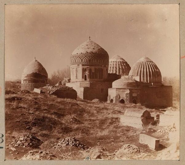 The earliest images of Shah-i Zinda are recorded in the Turkestan Album (1872) commissioned by Konstantin Petrovich von Kaufmann (1818-1882), the first governor general of Russian Turkestan. Excavations of the site started in 1922 and continued until 1925. However, a systematic approach to the study of its architecture, archaeological layers and history did not begin until 1957 when the excavations were led by Nina B. Nemtseva, who worked at Shah-i Zinda until 2001. After 2005 Shah-i Zinda underwent a massive restoration campaign throughout which new mausoleums were built. Original Timurid tile work was substituted by modern mass-produced tiling. The remains of the portal to the 11th-century Qarakhanid Madrasa (1066) were demolished. Several Qurʻanic texts (3:169, 3:170) were added to the main entrance portal originally built in 1435.