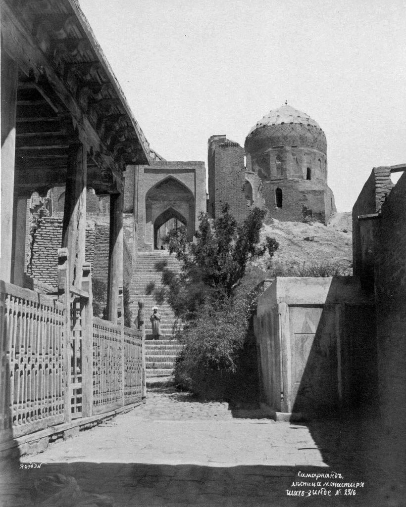 The Timurid necropolis of Shah-i Zinda (The Living King) commemorates the Muslim martyr Qutham ibn ‘Abbas (d. 677) who allegedly died in Samarqand. The complex is situated north of the city, on the southern slope of Afrasiyab, the oldest occupied hillside with archaeological layers dating back to the middle of the first millennium BC. The necropolis is one of the most sacred pilgrimage sites across Central Asia. The first structures at Shah-i Zinda including mausoleums and a royal madrasa (Islamic religious school) date back to the Qarakhanid dynasty (840–1212).