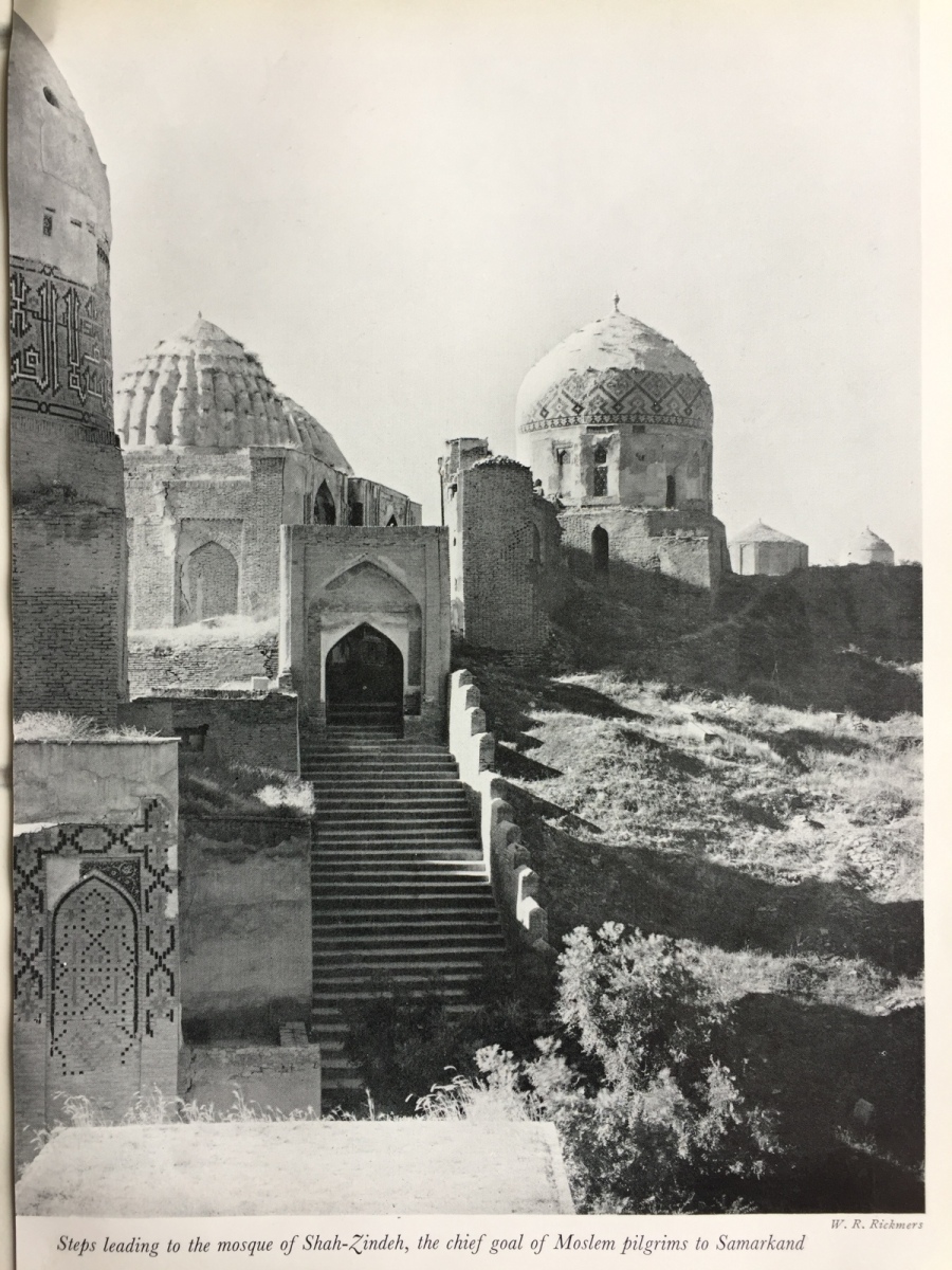 The Timurid necropolis of Shah-i Zinda (The Living King) commemorates the Muslim martyr Qutham ibn ‘Abbas (d. 677) who allegedly died in Samarqand. The complex is situated north of the city, on the southern slope of Afrasiyab, the oldest occupied hillside with archaeological layers dating back to the middle of the first millennium BC. The necropolis is one of the most sacred pilgrimage sites across Central Asia. The first structures at Shah-i Zinda including mausoleums and a royal madrasa (Islamic religious school) date back to the Qarakhanid dynasty (840–1212).