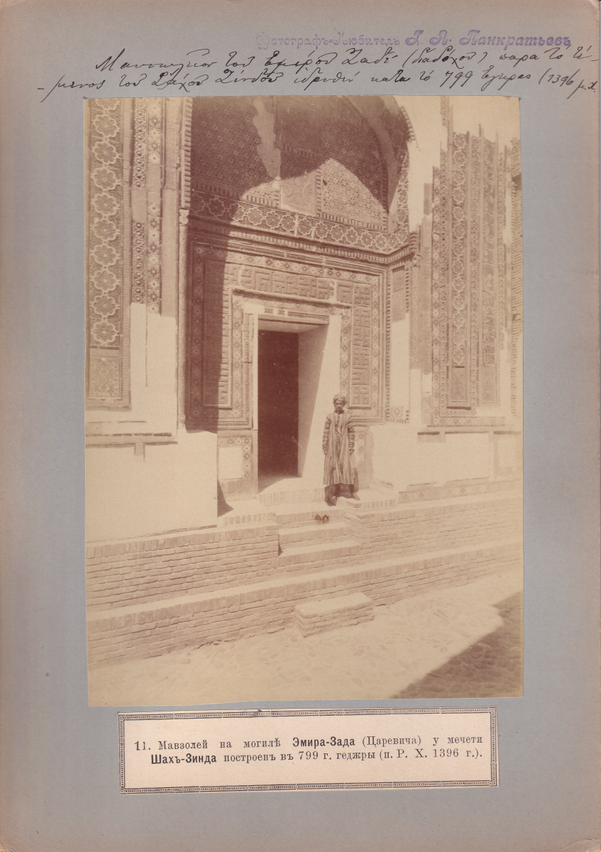 The earliest images of Shah-i Zinda are recorded in the Turkestan Album (1872) commissioned by Konstantin Petrovich von Kaufmann (1818-1882), the first governor general of Russian Turkestan. Excavations of the site started in 1922 and continued until 1925. However, a systematic approach to the study of its architecture, archaeological layers and history did not begin until 1957 when the excavations were led by Nina B. Nemtseva, who worked at Shah-i Zinda until 2001. After 2005 Shah-i Zinda underwent a massive restoration campaign throughout which new mausoleums were built. Original Timurid tile work was substituted by modern mass-produced tiling. The remains of the portal to the 11th-century Qarakhanid Madrasa (1066) were demolished. Several Qurʻanic texts (3:169, 3:170) were added to the main entrance portal originally built in 1435.