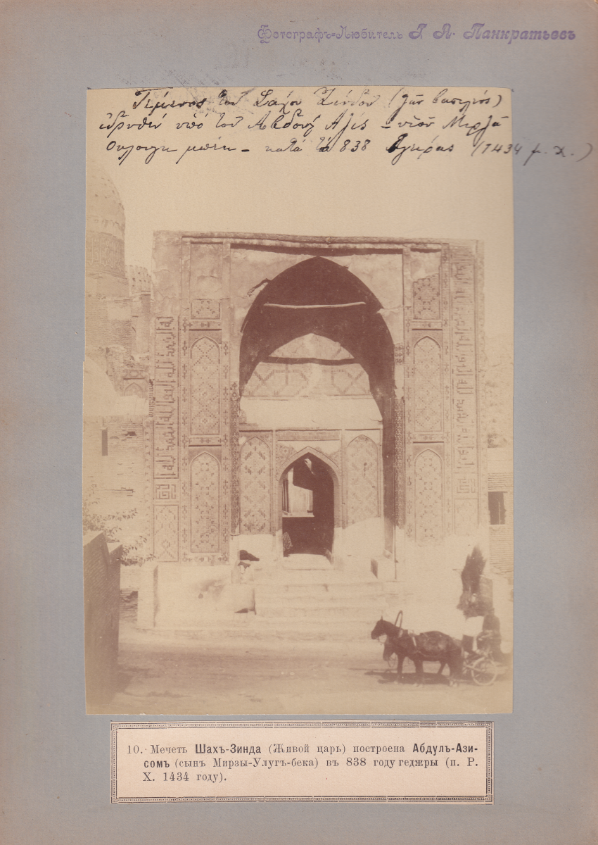 The earliest images of Shah-i Zinda are recorded in the Turkestan Album (1872) commissioned by Konstantin Petrovich von Kaufmann (1818-1882), the first governor general of Russian Turkestan. Excavations of the site started in 1922 and continued until 1925. However, a systematic approach to the study of its architecture, archaeological layers and history did not begin until 1957 when the excavations were led by Nina B. Nemtseva, who worked at Shah-i Zinda until 2001. After 2005 Shah-i Zinda underwent a massive restoration campaign throughout which new mausoleums were built. Original Timurid tile work was substituted by modern mass-produced tiling. The remains of the portal to the 11th-century Qarakhanid Madrasa (1066) were demolished. Several Qurʻanic texts (3:169, 3:170) were added to the main entrance portal originally built in 1435.