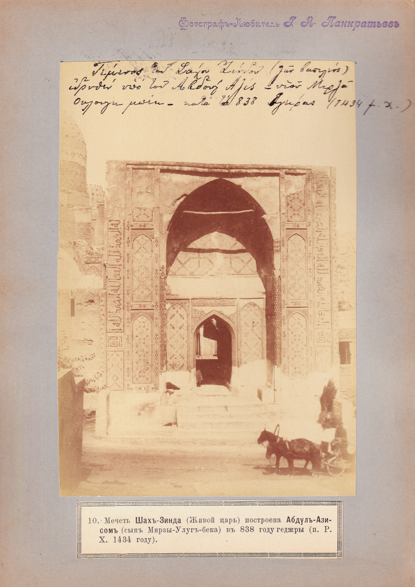 The earliest images of Shah-i Zinda are recorded in the Turkestan Album (1872) commissioned by Konstantin Petrovich von Kaufmann (1818-1882), the first governor general of Russian Turkestan. Excavations of the site started in 1922 and continued until 1925. However, a systematic approach to the study of its architecture, archaeological layers and history did not begin until 1957 when the excavations were led by Nina B. Nemtseva, who worked at Shah-i Zinda until 2001. After 2005 Shah-i Zinda underwent a massive restoration campaign throughout which new mausoleums were built. Original Timurid tile work was substituted by modern mass-produced tiling. The remains of the portal to the 11th-century Qarakhanid Madrasa (1066) were demolished. Several Qurʻanic texts (3:169, 3:170) were added to the main entrance portal originally built in 1435.