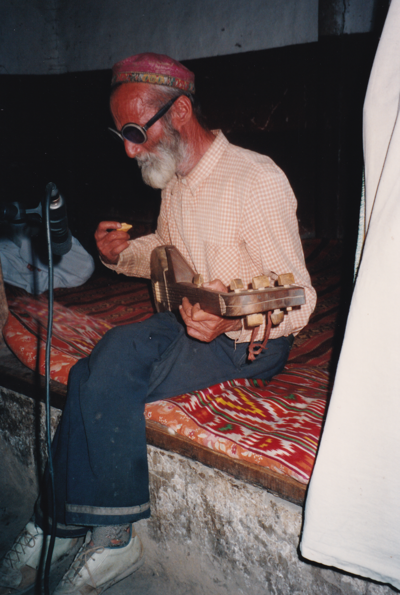 Most musicians in the villages of Badakhshan are trained and experienced but not professional players, at least according to Western standards, insofar as their main occupation is to carry out the daily duties belonging to their sedentary agricultural village life. There are only a few professional musicians who can make an, although modest, living out of their performances, like the setar player Mamadato Tavalāyev from Khorog. They generally can’t read notes and learn the music and the songs by ear from their family or from other musicians in their village. In many cases they are unable to give information about tunings, melodic modes or other musicological details, but fortunately some performers, especially Jonboz Dushanbiyev, Mojon and Mamadato Tavalāyev are really specialists and were very helpful in giving many details, orally and from their notebooks, about the place of music in their Ismaili context, melodic modes, performance practice, context of performances and the origin of their instruments. However, the majority of the performers are amateurs who regard their performances as a service to the community, and as a consequence they generally refused money for recordings in the beginning, but due to the poverty in the country and a lot of insistence of the researchers they finally would accept payment. Each village has its own performers, who are in many cases excellent and experienced singers and players with an exceptional memory for text and melody, capable of playing and singing for hours. Even in the most remote villages performers appeared to know their poets and poetry and produced in many cases notebooks with written texts of classical Persian poets. The human voice is predominant and still plays an important role in preserving and disseminating the oral culture of Badakhshan, and the role of the instruments is mainly to accompany the singer. Pure instrumental music forms only a small part of the performance practice in the villages.